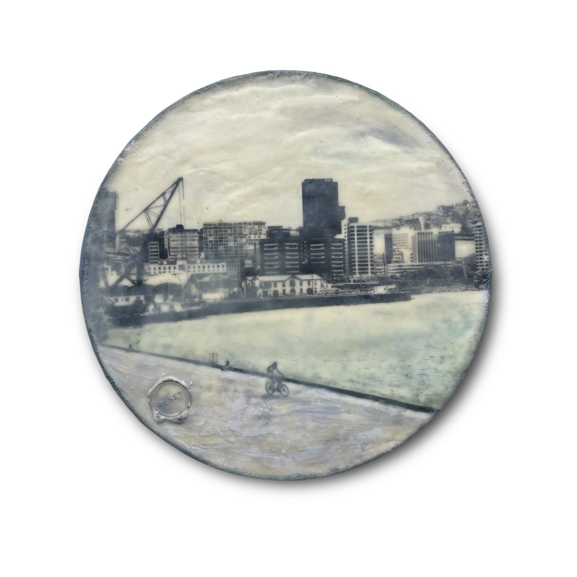 Wellington waterfront artwork on a wooden round. A lone biker enjoys the day in the foreground.