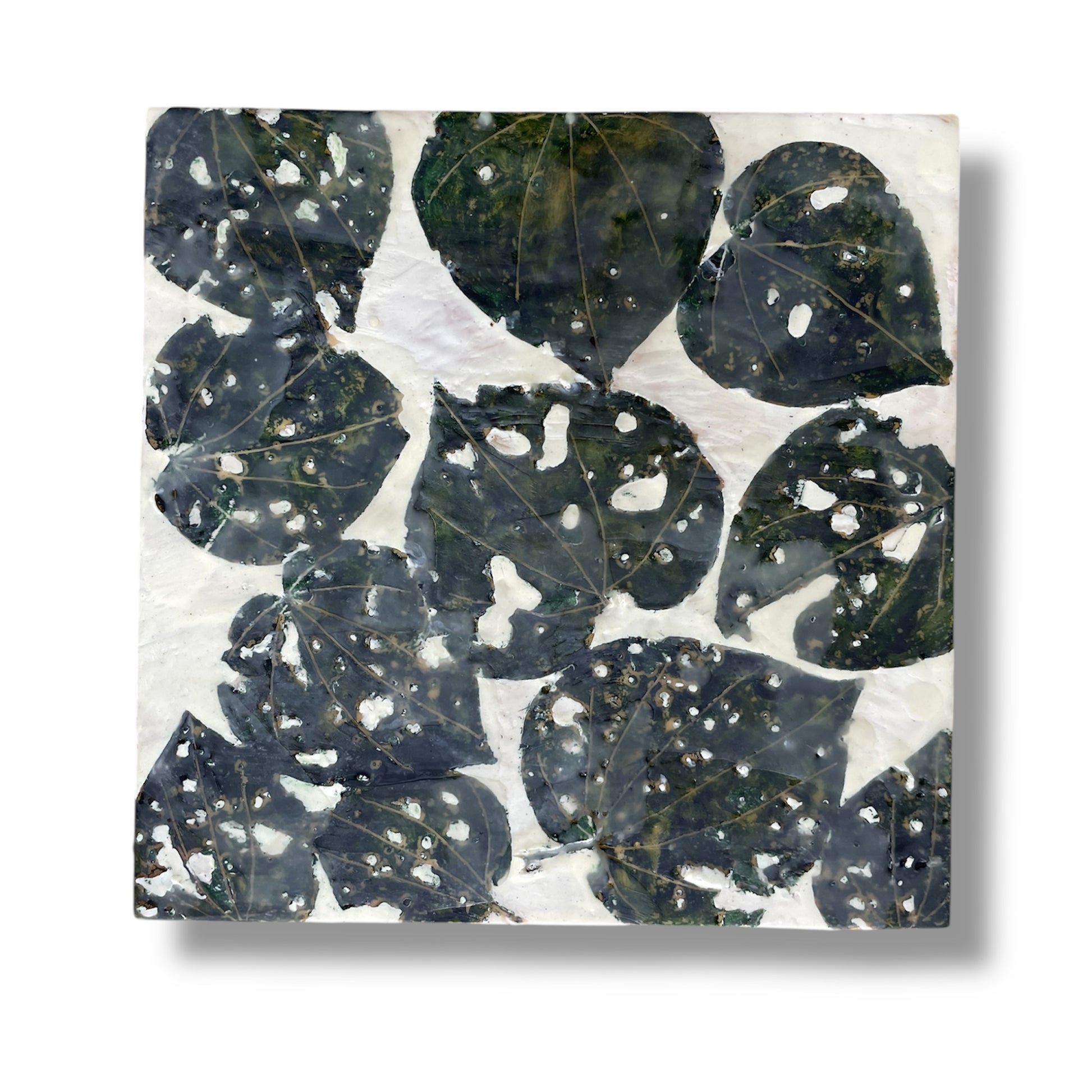 This textural artwork is made from encaustic medium, shellac ink and oil. Get lost in its waxy layers.