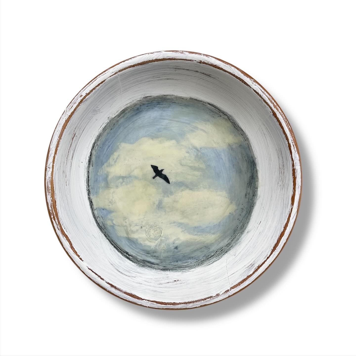 This encaustic artwork is called “quiet skies”. It’s painted into a large upcycled wooden bowl made from native kauri timber.